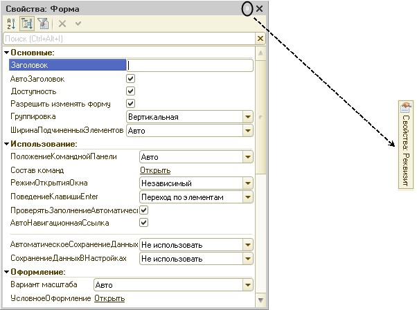 При наведении курсора мыши на изображение свернутой палитры свойств она будет открываться. Так же, как обычно, палитра свойств будет открыта при двойном щелчке на элементе, реквизите или команде формы.