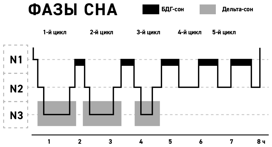 После этого вы либо просыпаетесь, либо переходите ко сну с БДГ. Такой полный цикл длится где-то полтора часа.