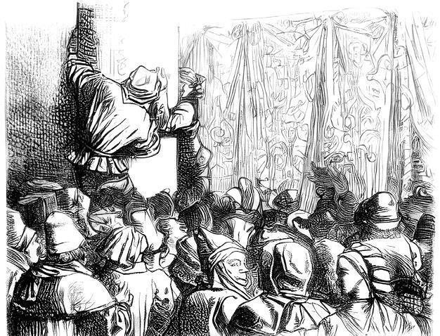Народ больше всего теснился в проходах Дворца правосудия, так как было известно, что прибывшие третьего дня фламандские послы намеревались присутствовать на представлении мистерии и на избрании папы шутов, которое также должно было состояться в большой зале Дворца.