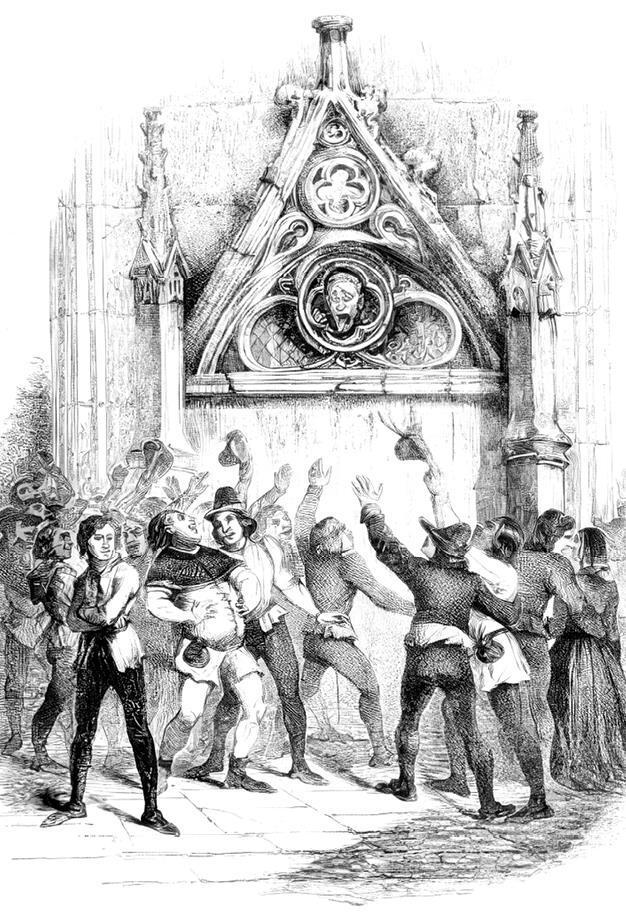 Заперев двери домов и лавок, толпы горожан и горожанок с самого утра потянулись отовсюду к упомянутым местам. Одни решили отдать предпочтение потешным огням, другие – майскому дереву, третьи – мистерии. Впрочем, к чести исконного здравого смысла парижских зевак, следует признать, что большая часть толпы направилась к потешным огням, вполне уместным в это время года, другие – смотреть мистерию в хорошо защищенной от холода зале Дворца правосудия; а бедному, жалкому, еще не расцветшему майскому деревцу все любопытные единодушно предоставили зябнуть в одиночестве под январским небом, на кладбище Бракской часовни.