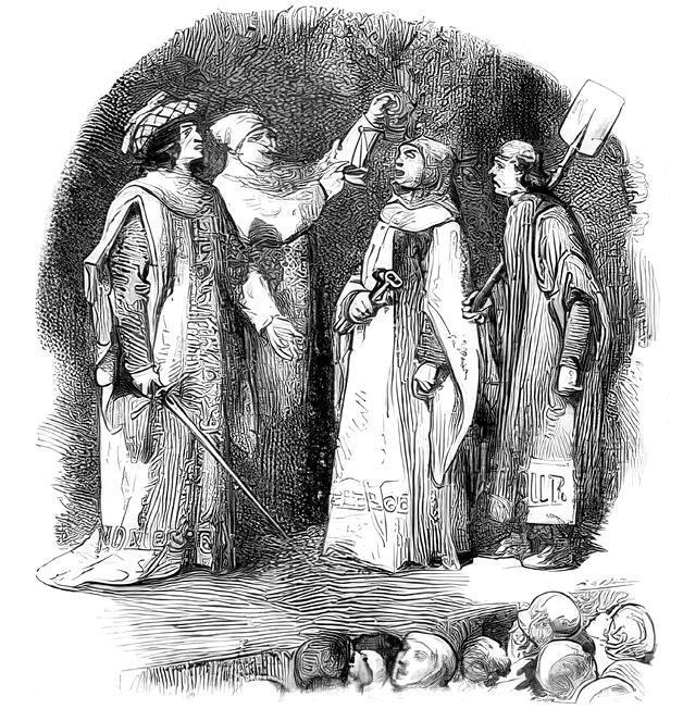 Нудный монолог привратника, однако, окончился; все уже собрались, и Гренгуар вздохнул свободно. Комедианты снова мужественно принялись декламировать. Но тут встает чулочник, мэтр Копеноль, и среди всеобщего напряженного молчания произносит ужасную речь: