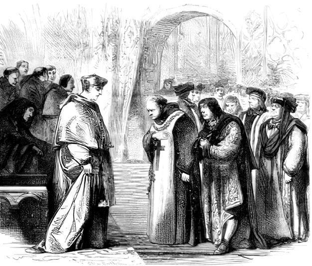 Действительно, ректор и все университетские сановники торжественно шествовали по дворцовой площади навстречу послам. Школяры, облепившие подоконник, приветствовали шествие язвительными насмешками и ироническими рукоплесканиями. Ректору, который шел впереди, пришлось выдержать первый залп, и залп этот был жесток.