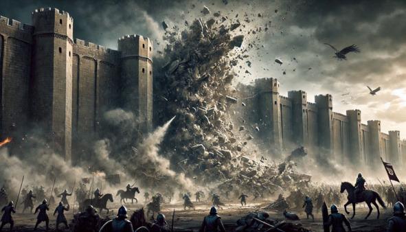 Ожидание не продлилось долго. Вскоре брюхо и горло зверя начали светиться и пульсировать тёмно-фиолетовым светом. Чудовище, встав на задние лапы, раскрыло пасть. Когда раздался звук искрящегося заряда, зверь поднял голову вверх, а затем с яростью выпустил поток энергии в сторону ворот. Огромная фиолетовая молния, похожая на гигантский луч, пронзила пространство, и через мгновение послышался оглушительный грохот. Ворота крепости были разрушены — образовалась дыра диаметром в пятьдесят метров.