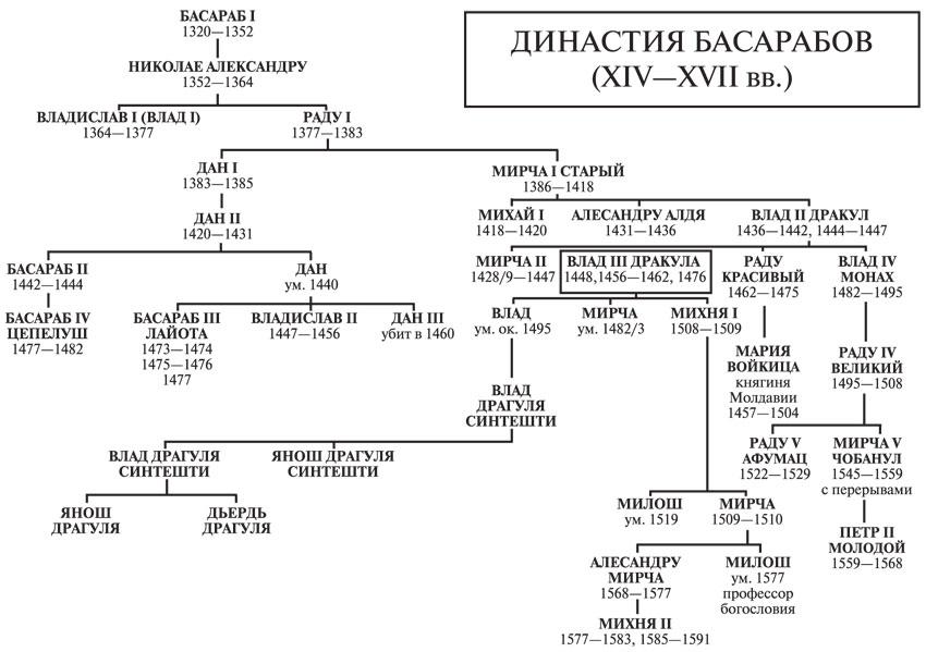 У сына Николае Александру, воеводы Раду Негру (Черного), было два сына — Мирча и Дан, положившие начало двум враждующим ветвям династии Басарабов. Будучи старшим, Дан I взошел на престол, но просидел на нем всего три года: после его гибели в битве с болгарами господарем стал Мирча, правивший с 1386 по 1418 год и прозванный Старым скорее за мудрость, чем за возраст. Чтобы удержаться у власти, он признал себя вассалом Венгрии, а его соперники из рода Данешти тут же попросили помощи у турок, уже подступивших к Дунаю. Отныне всем правителям Валахии и Молдовы приходилось лавировать между двумя этими силами, одинаково опасными для румын. Турки угрожали обратить их в ислам или задушить поборами, превратив в угнетенное «стадо» (райя), как они называли подданных-христиан. Венгры грозили таким же угнетением плюс обращением в католичество. Вдобавок обе враждующие стороны воевали друг с другом на валашской земле, принося ее жителям немало бед. В старинной балладе говорится: «Валахия разорена и разорвана на части, ее жителей загнали в горы жестокие турки и варвары-венгры. Они убивают старых и обращают в рабство юных, насилуют девушек и уводят юношей в свое войско, они так опустошили страну, что в ней некому пахать и сеять».