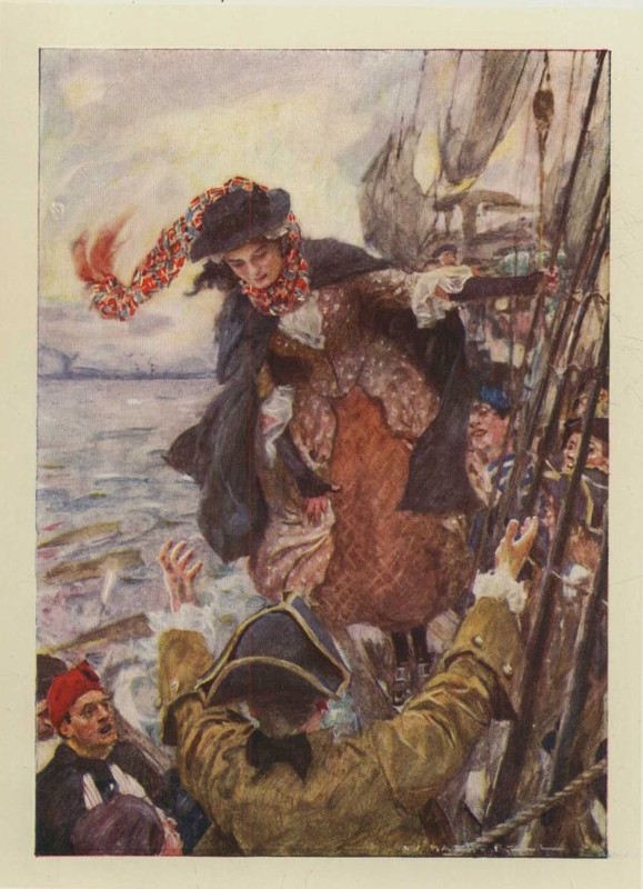 "I began to think I had made a fool's bargain, that it was merely impossible Catriona should be got on board to me, and that I stood to be set ashore in Helvoet all by myself ... But this was to reckon without the lass's courage ... Up she stood on the bulwarks and held by a stay, the wind blowing in her petticoats, which made the enterprise more dangerous, and gave us rather more a view of her stockings than would be thought genteel in cities"—(Catriona.)