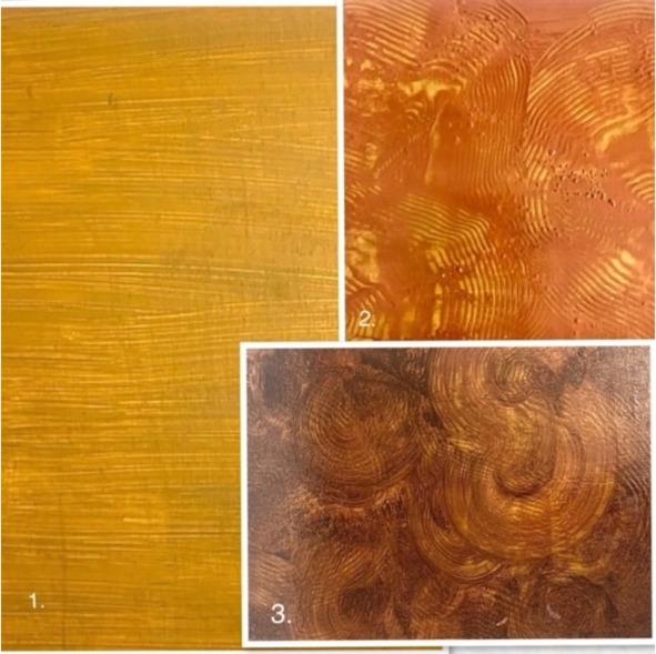 Третий слой краски — умбра жженая+сиенна жженая+черная+вода. Нанести широкой кистью жидкую краску и зубчатым шпателем прорисовать волнообразные хаотичные линии, тем самым обнажая предыдущий слой. Лак 2—3 слоя. Просушить. (Рис. 1.3. поз.3).
