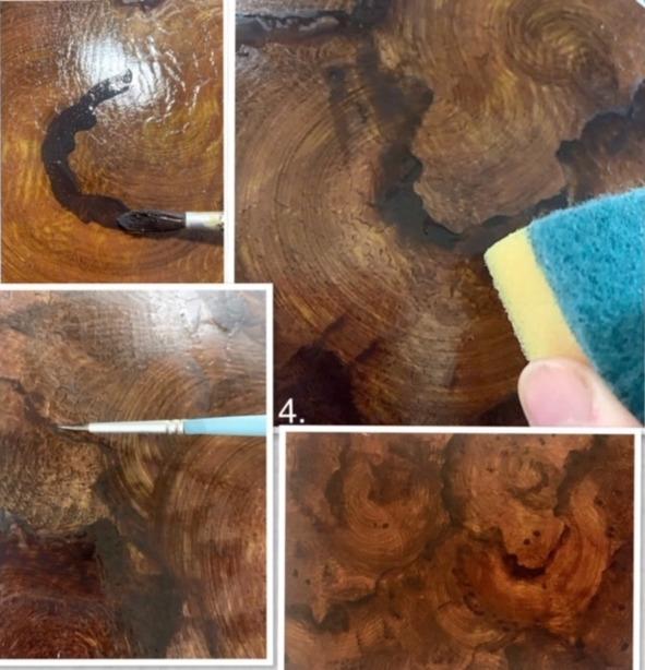 Четвертый слой краски — умбра жженая+сажа газовая (черная краска) +вода. Нанести круглой тонкой кистью длинные линии, имитирующие темные участки дерева, прокручивая кисть и поворачивая ее в разные стороны. Очень толстые линии подтереть кисточкой или влажной салфеткой. Губкой «почпокать» поверх линий в некоторых местах. Тонкой кистью добавить извилистых линий, имитирующих рисунок дерева. Поставить точки черной краской в некоторых местах. Просушить. Нанести 2—3 слоя глянцевого акрилового лака. Последний слой — матовый лак. (Рис. 1.4. поз.4).