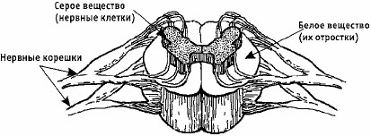 Все сегменты устроены одинаково. Они состоят из серого и белого вещества, как и головной мозг. Серое вещество, т. е. нервные клетки, находится в центре и по форме напоминает крылья бабочки или букву Н (рис. 6). Вокруг нервных клеток проходят пучки, или тракты, аксонов, имеющих белый цвет.