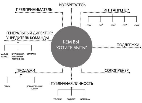 Все вопросы, которые я задаю и которые могут вам показаться открытием, должны привести вас к осознанию пути, который подходит вам лучше всего. Главное – найти оптимальную должность, которая подчеркнет ваши таланты. Учредитель? Генеральный директор? Директор по стратегическому развитию? Лидер продаж? Номер два? Бизнес-девелопер? Интрапренер, то есть сотрудник, который разрабатывает инновационную идею или проект в компании? Или солопренер, то есть самостоятельный бизнесмен? Список можно продолжать. Мы живем в эпоху, когда предприниматели становятся героями газетных заголовков, но такая жизнь может вам не подойти. Это не значит, что у вас не будет возможности для создания богатства и обретения удовлетворения.