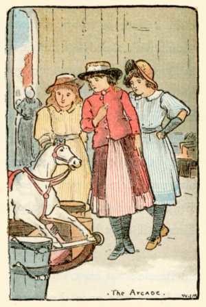 "Of course you may. Every body does," said Letty; "especially at the bazaar. It's not windows; it's all open, you know, like stalls at a market," explained Madge; "it's a regular bazaar. Not look at it!—why it's made to be looked at. And oh; Bessie," Letty went on again, "you will be amused at the big tailor's, or ready-made clothier's, as mamma calls it, at the corner of the arcade. It's something like Madame Tussaud's—such a lot of wax dummies at the door. And they change their clothes every few days. Some of them are quite big, like men; and some little boys. They've got one now which they think is dressed like an English sailor-suit boy—you never saw such a costume! And there's a man in a red coat—our boys say he is meant to be an English 'milord' dressed for 'the hunt.'"