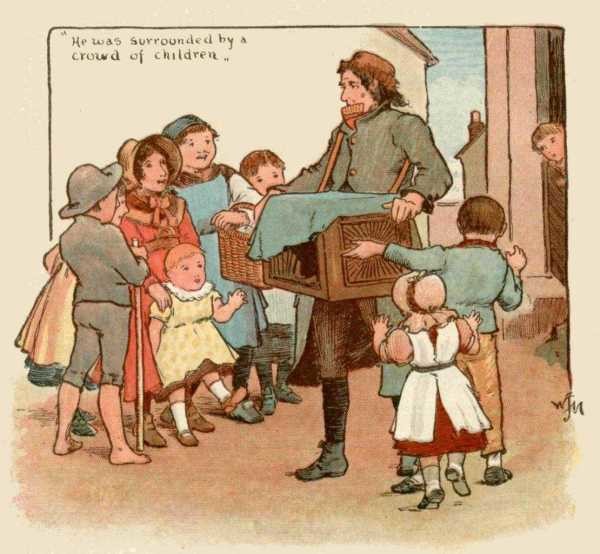 We had not stood there more than a minute or two when a strange, well-known sound caught my ears, squeak, squeal, rattle, rattle, rattle. Oh, dear! I felt myself beginning to tremble; I am sure I grew pale. The children we were watching started up, and ran some paces down the street to a corner, when in another moment appeared what I already knew was coming—the man with the Pan-pipes! But never had the sight of him so terrified me. For he was surrounded by a crowd of children, a regular troop of them following him through the poor part of the town where we were. If I had kept my wits, and looked on quietly, I would have soon seen that the children were not the least afraid, they were chattering and laughing; some, I fear, mocking and hooting at the poor imbecile. But just at that moment the last touch was added to my terror by my little brother pulling his hand out of mine.