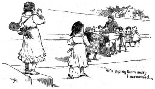 "He's piping them away," I screamed, and then I am ashamed to say I turned and fled, leaving Baby to his fate. Why I did not run into the house and call nurse, I do not know; if I thought about it at all, I suppose I had a hazy feeling that it would be no good, that even nurse could not save us. And I saw that the crowd was coming my way, in another minute the squeaking piping would be close beside me in the street. I thought of nothing except flight, and terrified that I too should be bewitched by the sound, I thrust my fingers into my ears, and dashed down the street in the opposite direction from the approaching crowd. That was my only thought. I ran and ran. I wonder the people I passed did not try to stop me, for I am sure I must have looked quite as crazy as my imaginary wizard! But at last my breath got so short that I had to pull up, and to my great relief I found I was quite out of hearing of the faint whistle of the terrible pipes.