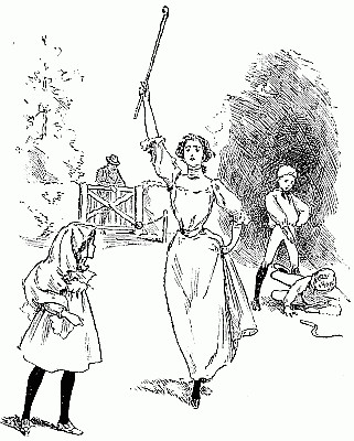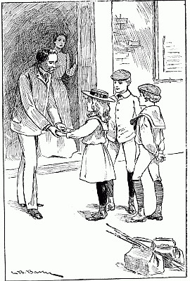 The little girl had never stirred, but stood gazing up at the big man who held her hands"