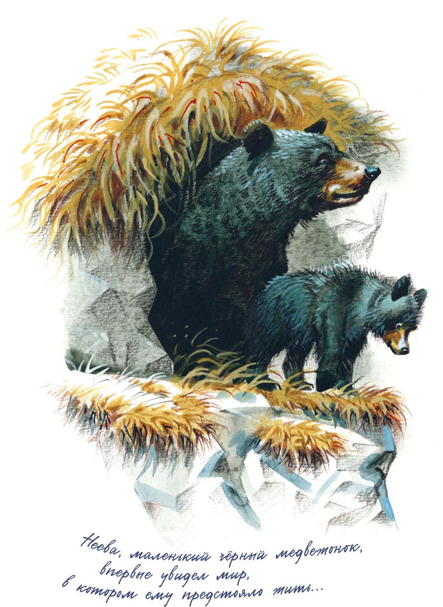 Неева, маленький чёрный медвежонок, впервые увидел мир, в котором ему предстояло жить, в конце марта – на исходе Орлиного месяца. Нузак, его мать, была уже пожилой медведицей, а потому любила поспать подольше, чтобы понежить свои ревматические косточки. Вот почему в эту зиму – в зиму рождения маленького Неевы – она проспала не обычные три месяца, а целых четыре, и Нееве, когда они вылезли из берлоги, было больше двух месяцев, хотя чаще всего медвежата начинают знакомство с лесной жизнью в шестинедельном возрасте.