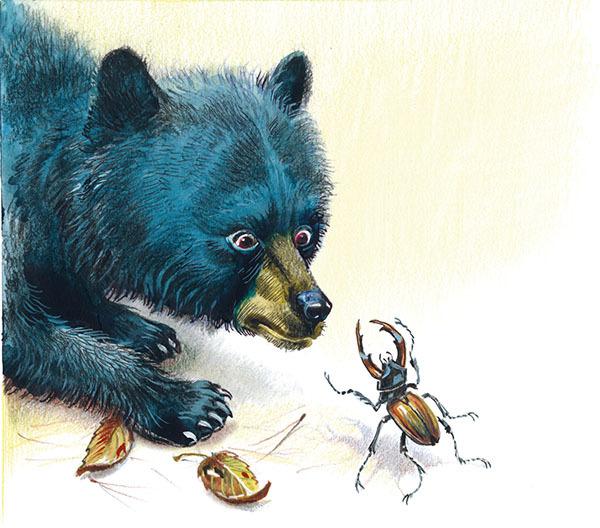 Это был гигантский рогач, дюйма два длиной. Его грозные челюсти были иссиня-чёрными и загибались, как железные крючья. Ярко-коричневые жёсткие крылья блестели на солнце, точно металлическая броня. Неева припал к земле и не сводил глаз с жука. Сердце его отчаянно билось. Жук был от него в двух шагах и… двигался прямо на него. Это озадачило и возмутило Нееву. Все остальные живые существа, встреченные в этот день, убегали от него, а жук не захотел! Рогач двигался вперёд, перебирая шестью ногами, и прищёлкивал – это прищёлкивание Неева расслышал очень хорошо. В медвежонке взыграла воинственная кровь Суминитика, его отца, и он осторожно протянул вперёд лапу. В тот же момент Чегавассе, жук, преобразился самым страшным образом: его крылья загудели, как круговая пила, челюсти раскрылись так, что могли бы защемить палец взрослого мужчины, и он весь завибрировал, словно исполняя боевой танец.