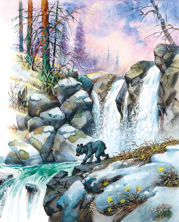 Именно с того дня, как Нузак отправилась в свой поход, и начались настоящие приключения Неевы. В глухих таинственных чащах ещё попадались сугробы, даже не начинавшие таять, и первые два дня Неева всё время хныкал, тоскуя по солнечной долине. Они прошли мимо водопада, и Неева впервые узнал, с какой бешеной силой может мчаться вода. Всё темнее, мрачнее и глуше становился лес, по которому шла Нузак. В этом лесу Неева получил первые охотничьи уроки. Нузак уже далеко углубилась в низины между хребтом Джексона и водоразделом, с которого берут начало притоки Шаматтавы. Ранней весной эти места превращаются в настоящий медвежий рай.