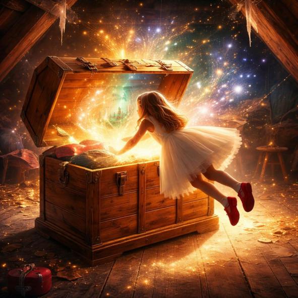 Девочка сделала глубокий вдох, ощутив запах старой кожи, далёких путешествий и чего-то невероятно родного. Она перегнулась через деревянный край — и почувствовала, как её платье вдруг стало легче, а в ушах зазвучал тихий, мелодичный гул, будто где-то играл оркестр из шёпота и шороха шёлка.