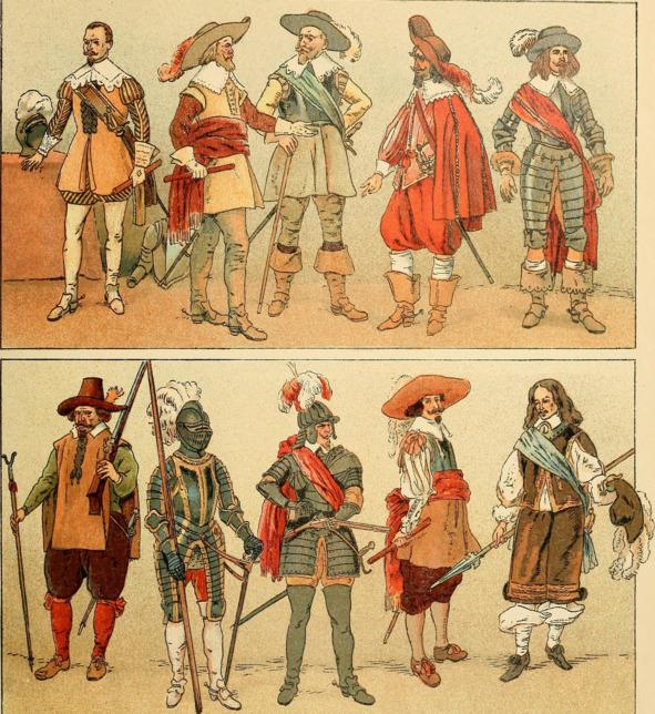 Если была возможность, то солдаты и кнехты старались одеться не хуже своих офицеров: красочно, удобно, с украшениями, к примеру, типа розеток, страусиным (на худой случай — петушиным) пером в шляпе или пышным плюмажем, штанами с вышивкой, кружевными воротниками. Красивая одежда внушала уважение, поднимала солдата в собственных глазах — это факт. Но скажите на милость, надолго ли хватало всей этой роскоши? Максимум на один поход или на одно сражение. Солдаты маршировали, ели не за столом, а на ходу или сидя на земле, работали, сражались и спали в одной и той же одежде. Хорошо, если лето и сухо, а если осень, затяжные дожди, грязь, лужи? Поэтому куда дольше служила простая, прочная и практичная одежда и обувь.