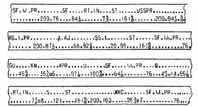 Ниже, во второй строке, указываются все цены и объемы торгов в сокращенной форме для ускорения процесса. Букву «S» часто использовали в котировочных ценах как пробел между количеством торгуемых акций и котировочной ценой, «S» значила то же, что и точка на ленте. Символ «SS» относился к небольшому числу акций, обычно менее 100. Наконец, в котировках часто не указывались нули, опять же ради скорости. Итак, если в примере выше найти US Steel (X), то в первой строке ленты мы увидим 10 000 акций по цене 185 3/4, а в конце ленты мы видим, что акции котировались по цене 2,5 1/2. Итак, 200 акций, но в такой день цена все еще составляла 185, или упала до 175, или даже 165, как это произошло со многими акциями.