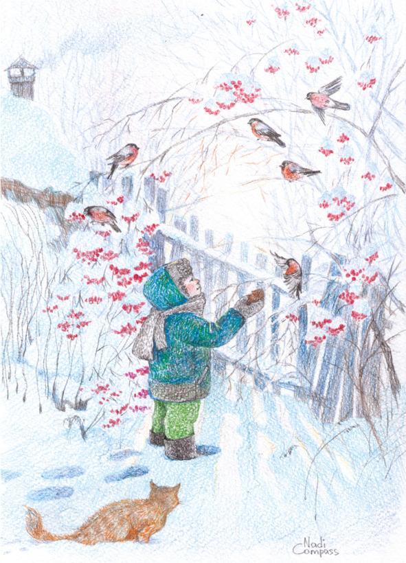 Михаил Иванович отложил в сторону ручку и блокнот, в который записал сказку. Он её придумал в детстве, а теперь вдруг вспомнил в это чудесное зимнее утро. И ему стало так хорошо на душе. Отчетливо вспомнился морозный деревенский воздух, запах бабушкиных пирожков и яркая стайка снегирей, прилетавших к нему в гости каждую зиму.