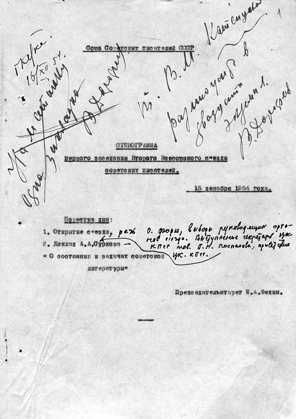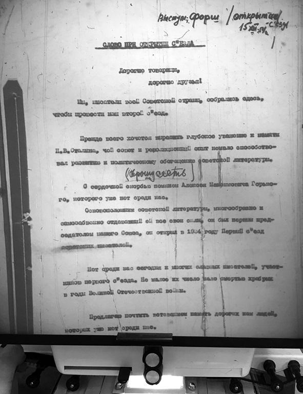 Впрочем, эти стенограммы как незыблемое свидетельство тоже проблематичны, поскольку первоисточника — текста, который записывался непосредственно во время выступлений, — среди них нет. В фонде сохранились лишь машинописи, сделанные на основе отсутствующей стенограммы, а также разнородные материалы, предоставленные самими писателями после выступлений.