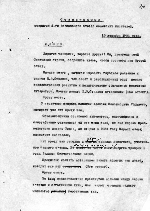 Прежде всего хочется выразить глубокое уважение к памяти Иосифа Виссарионовича Сталина, чей совет и революционный опыт немало способствовал развитию и политическому обогащению советской литературы. (Прошу сесть.) (1, 1; курсив мой. — В. В.)