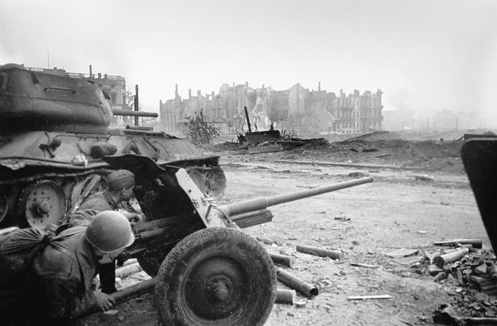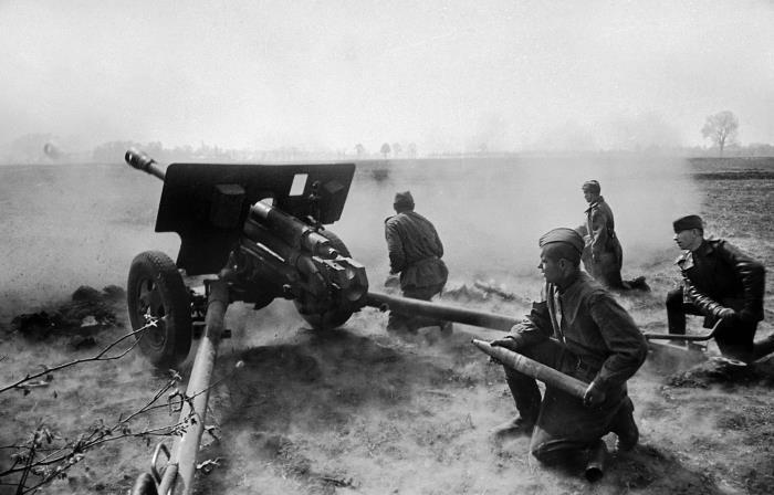 Орудийный расчет ведет бой на окраине города. 1-й Белорусский фронт/ © Владимир Гребнев / РИА Новости