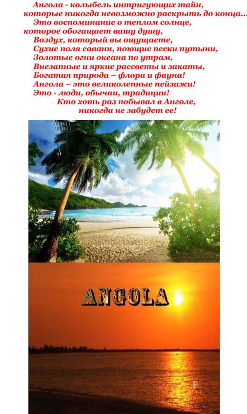 Сегодня об Анголе написано много научно-популярных и художественных книг, монографий, статей. А в Интернете каждый, уважающий себя путешественник, заводит свой личный блог (ЖЖ — Live Journal), в котором активно делится наблюдениями, впечатлениями от поездок, опытом, иллюстрируя свои рассказы яркими, колоритными фотографиями и видеосюжетами.