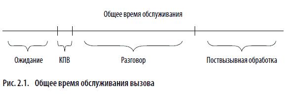 Бывает также полезно знать общее время нахождения вызова в системе, которое складывается из времени ожидания (Wait Time), времени посылки длинных гудков или, словами связистов, сигнала контроля посылки вызова — КПВ (Ring Time), времени разговора (Talk Time) и времени поствызывной обработки (Wrap-Up Time) (рис. 2.1).