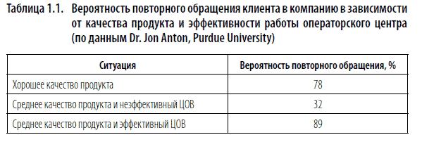 Позвольте подтвердить все вышесказанное несколькими аргументами. Например, доктор Джон Антон из Университета Пердью, штат Индиана, приводит следующие интересные данные о том, как зависит вероятность повторного обращения клиента в компанию от качества продукта и эффективности работы операторского центра (табл. 1.1).