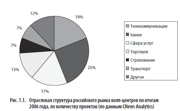К сожалению, самые свежие данные, которыми я располагаю, — это исследование агентства CNews Analytics, подводящее итоги 2006 года (рис. 1.1 и 1.2). Согласно этому исследованию, банковский сектор лидировал по числу инсталляций ЦОВ (25% проектов) и занимал второе место по объему внедренных операторских мест (19%). Страховые компании менее активны. У них эти показатели составляют 7% по числу реализованных проектов и 5% — по количеству мест. Из материалов исследования явно видно, что финансовый сектор активно развивается с точки зрения внедрения Центров обслуживания вызовов. Думаю, за прошедшие два года ситуация еще больше изменилась. Соответственно, меняется и структура вертикальных рынков за счет того, что увеличивается доля финансового сектора.