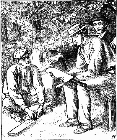 So they leave the island and go to the tent, and after deep consultation Arthur is sent in, and goes off to the wicket with a last exhortation from Tom to play steady and keep his bat straight. To the suggestions that Winter is the best bat left, Tom only replies, "Arthur is the steadiest, and Johnson will make the runs if the wicket is only kept up."