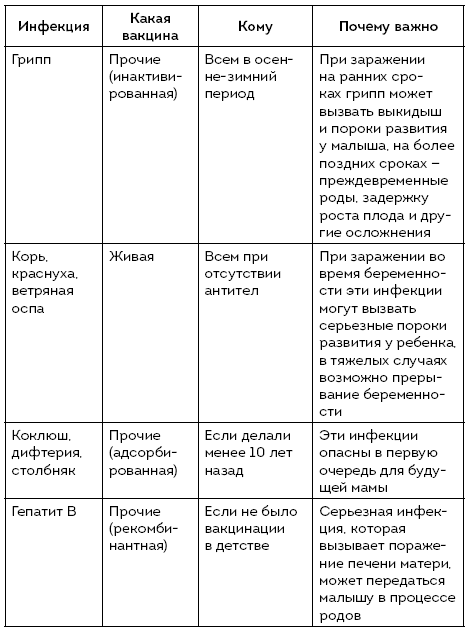 Многие инфекционные заболевания представляют опасность во время беременности; к счастью, от некоторых из них существуют вакцины. Чтобы быть защищенной к моменту зачатия, нужно, чтобы в ответ на вакцину успели выработаться антитела, обычно для этого требуется 2–3 недели.