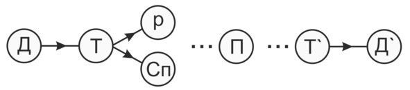 1. Отношения распределения (Р) возникают в сфере кругооборота денежного капитала на стадии производственного потребления (П) с целью формирования новой стоимости (Т') и задают вектор движения потоку денежных средств, поступивших из внешней среды (Д').