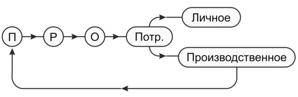 Экономический смысл внутреннего обмена затратами основных факторов производства выражается в том, что стоимость этих затрат формирует базис вновьсоздаваемой стоимости товара, а процесс потребления затрат называется производственным потреблением. В этом смысле производство есть потребление, а потребление — суть производство. Иначе говоря, производство есть потребление стоимости живого и прошлого труда путём внутреннего обмена энергией этих факторов.