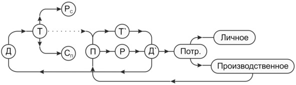 Соотношение величины авансированного денежного потока (Д) и встречного ему потока денег за реализованный товар (Д») определяют сложившиеся в экономике отношения потребления, как неотъемлемая часть воспроизводственного процесса (рис. 3).