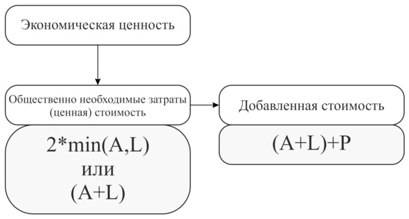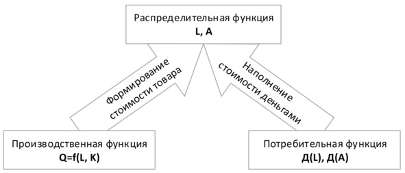 Согласно производственной функции, выход продукции определяется оптимальным сочетанием факторов производства (Q=L×K). Следовательно, экономическая ценность товара (ЦT) является функцией от ценности потреблённых в производстве факторов: