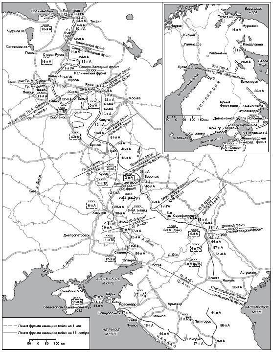 При полном отсутствии с советской стороны ясных объяснений относительно стратегии на лето 1942 г. представляется, что она основывалась на неправильном понимании намерений Германии, что повлекло за собой тяжелые последствия, которые едва не стали катастрофическими. Со свойственным ему упрямством, которое уже было продемонстрировано годом ранее, советское командование продолжало держать свои основные силы на центральном участке фронта. В конце июня 1942 г. 28 армий было сосредоточено между Ленинградом и Тулой и только 18 армий – между Тулой и Кавказом (сюда входили и 5 армий Брянского фронта, основной задачей которого было прикрытие Москвы с юга). В составе Юго-Западного и Южного фронтов было 10 армий, три из которых были практически разбиты во время Харьковского сражения. Развернутые на непосредственных подступах к Москве Калининский и Центральный фронты имели в своем составе 15 армий. Такого развертывания войск советская сторона придерживалась в течение почти всего лета. Усиление южного участка фронта осуществлялось за счет вновь сформированных частей и соединений из резерва, а не за счет переброски сил с других участков фронта, как того ожидали немцы.