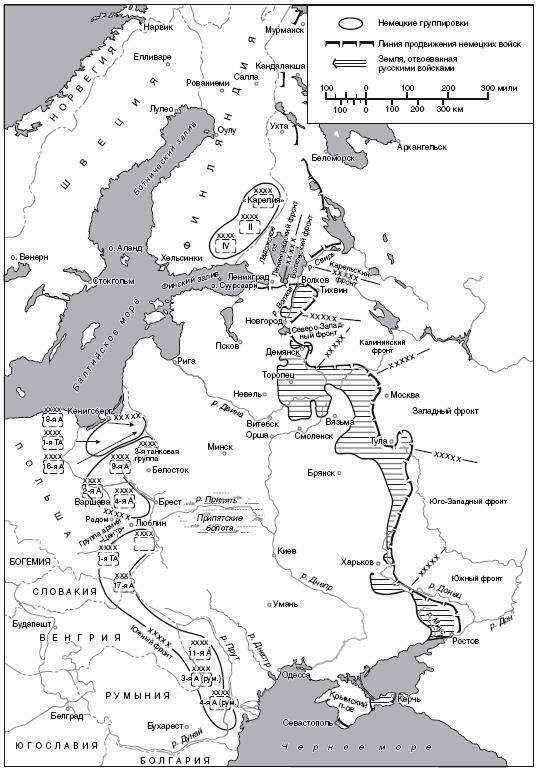 На практике вторжение осуществлялось даже более быстрыми темпами (по сравнению с предварительными прогнозами и расчетами, сделанными на командно-штабных играх). К концу второй недели боевых действий могло показаться, что ближайшая задача, а именно уничтожение главных сил Красной армии в приграничном сражении, была выполнена. В двух котлах – в районе Белостока и под Минском – по данным командования группы армий «Центр», было захвачено свыше 300 тыс. пленных. Несмотря на то что в начале наступления войска группы армий «Юг» продвигались вперед довольно медленно, в дальнейшем темпы наступления всех трех групп армий значительно выросли. К середине июля войска групп армий «Север» и «Центр» вышли к рекам Западная Двина и Днепр и форсировали их. По немецким оценкам, восточнее этих рубежей все главные промышленные центры русских теперь оставались без защиты. Силами группы армий «Центр» было осуществлено еще одно окружение крупной группировки советских войск в районе Смоленска. Войска группы армий «Юг» приступили к выполнению грандиозной операции по охвату и окружению группировки Красной армии на Украине, западнее Днепра.