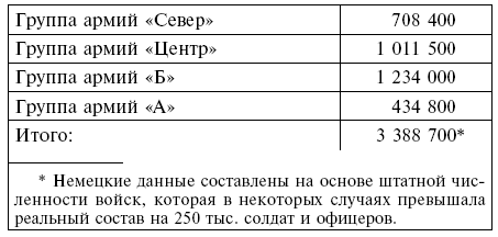 Общая численность войск, участвующих в кампании, должна была составить 3050 тыс. человек. Кроме того, из Норвегии планировалось перебросить на север Финляндии еще 4 дивизии общей численностью 67 тыс. солдат и офицеров. Группировка финской армии в составе 14 дивизий и 3 бригад насчитывала до 500 тыс. солдат и офицеров. Еще 14 пехотных дивизий и 3 бригады (все неполного состава) общей численностью 150 тыс. человек должна была выставить Румыния. На начальном этапе наступления в рамках операции «Барбаросса» силы вторжения располагали 3350 танками, 7184 артиллерийскими орудиями, 600 тыс. автомобилями и 625 тыс. лошадьми (общая численность 5,5 млн, около 4300 танков, свыше 47 тыс. орудий, около 5 тыс. самолетов. – Ред.).
