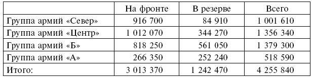 В армии были вновь сформированы танковые корпуса, а также, по примеру немцев, танковые армии. В численности войск Советский Союз имел преимущество. По данным немецкой стороны, по состоянию на 20 сентября Советский Союз имел в составе своих вооруженных сил на германском фронте 4 255 840 солдат и офицеров, в том числе 3 013 370 человек на переднем крае и 1 242 470 в резерве. Немецкие группы армий «Север» и «Центр» имели перед своим фронтом превосходящего их численно противника, а с учетом имевшихся в Красной армии резервов можно было с полной уверенностью заявлять о количественном перевесе советской стороны на всех участках фронта (у немцев и их союзников также имелись резервы. – Ред.). Сравнительные данные по количественному составу сил сторон, по данным отдела «Иностранные армии Востока», представлены в следующих таблицах: