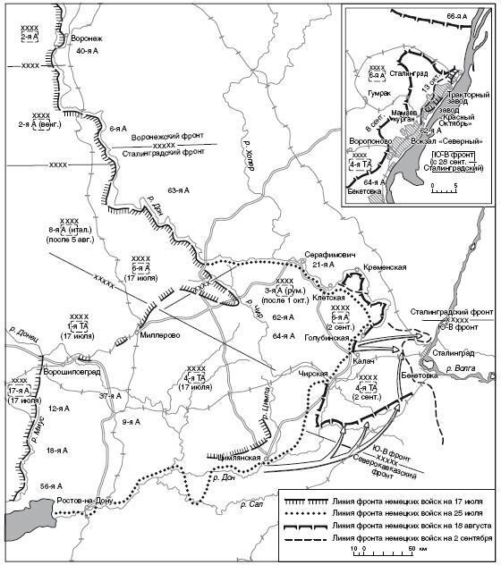 В советской истории принято считать датой начала Сталинградской битвы (или битвы на Волге, как она иногда стала называться в послесталинские времена) 17 июля 1942 г. В тот день Сталинградский фронт, который сменил расформированный 12 июля Юго-Западный фронт, ввел в бой вновь сформированные 62-ю и 64-ю армии. Первые эшелоны армий были выдвинуты в район рек Чир и Цимла на излучине Дона, в 160 км к западу от Сталинграда (см. карту 3).