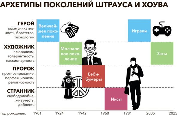 Одно поколение сменяет предыдущее, и каждое имеет свои задачу и архетип. Вот как описывали сменяющиеся поколения Штраус и Хоув: