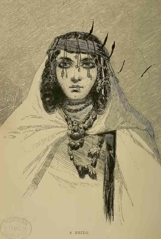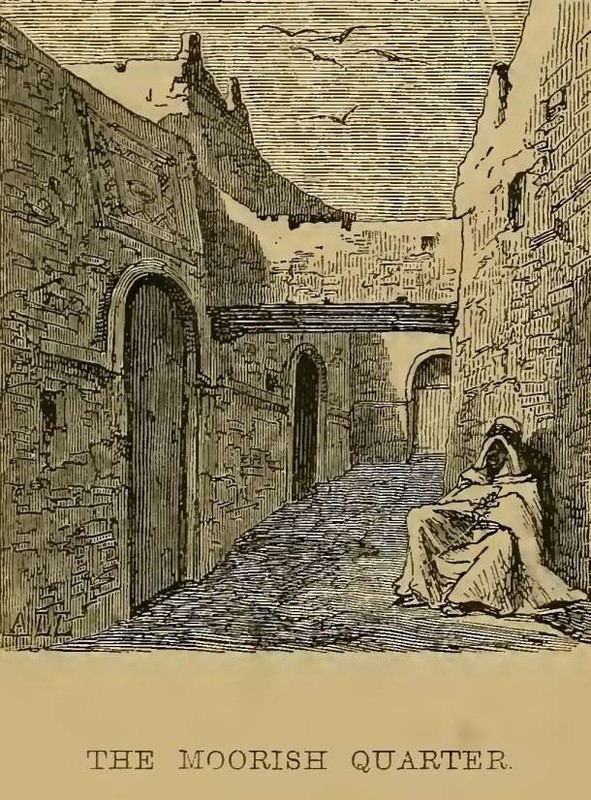 'Being anxious to obtain a sketch of one of the quaint streets of the upper town, I wandered one morning up its dark alleys and intricate byeways; and wishing to establish myself at a window, I knocked at a promising door, and was answered by a mysterious voice from behind a lattice; the door opened of itself, and I marched upstairs unmindful of evil. In the upper court I was instantly surrounded by a troup of women, in the picturesque private dress of the Moorish ladies, unencumbered with veil or yashmak.