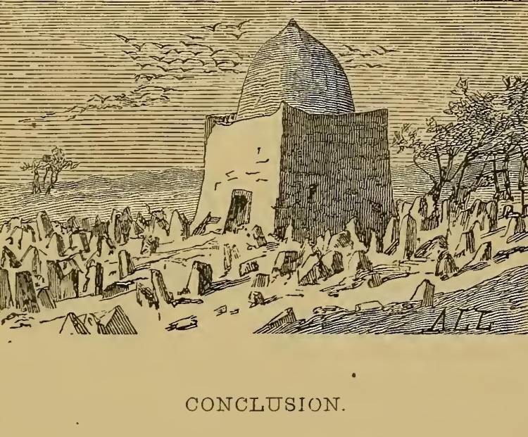 If he lack enthusiasm, still, before a scene so strange, let him think for a moment what manner of worship this, of the Arabs is; and contrast their system with that of the Vatican. The religion of the Arabs is a very striking thing, and its position and influence on their lives might put many professing Christians to the blush. An honest, earnest faith is theirs, be it right or wrong. If we examine it at all, we find it something more than a silly superstition; we find that it has been 'a firm belief and hope amongst twelve millions of men in Arabia alone, holding its place in their hearts for more than twelve hundred years.' It is a religion of Duty, an acting up to certain fixed principles and defined laws of life, untrammelled by many ceremonies, unshaken by doubts; a following out to the letter, the written law, as laid down for them by Mahomet, as the rule and principle of their lives.