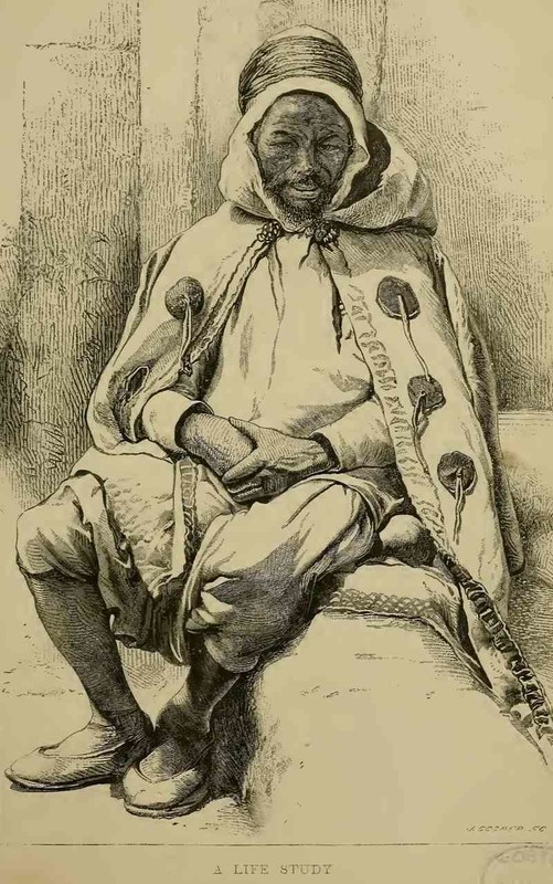 This is the prominent town type of Moor or Jew, the latter to be distinguished by wearing dark trousers, clean white stockings, French shoes, and a round cloth cap of European pattern. There are various grades, both of the Moors and Jews, some of course shabby and dirty enough; but the most dignified and picturesque figures are the tall dark Arabs and the Kabyles, with their flowing white bournouses, their turbans of camel's hair, and their independent noble bearing. Here we see them walking side by side with their conquerors in full military uniform and their conquerors' wives in the uniform of Le Follet, whilst white-robed female figures flit about closely veiled, and Marabouts (the Mahom-medan priests) also promenade in their flowing robes. Arab women and children lounge about selling fruit or begging furtively, and others hurry to and fro carrying burdens; and everywhere and ever present in this motley throng, the black frock-coat and chimney-pot hat assert themselves, to remind us of what we might otherwise soon be forgetting,—that we are but four days' journey from England.