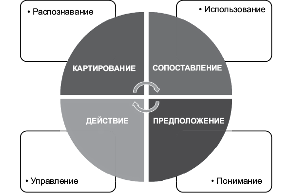 Структура эмоционального интеллекта проста и включает в себя четыре способности: распознавать, использовать, понимать эмоции и управлять ими. Каждая из них имеет свои особенности, и все они работают вместе, формируя эмоциональный интеллект. Мы используем более запоминающиеся названия, такие как картирование (распознавание), сопоставление (использование)8, предположение (понимание) и действие (управление) для лучшего запоминания (более легкого восприятия).