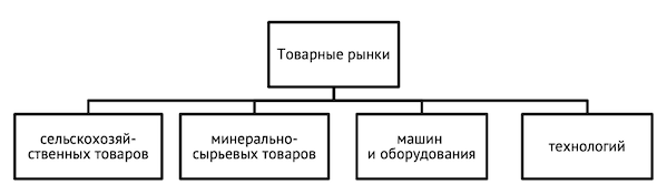 В учебнике МГИМО «Мировые товарные рынки», изданном в 2023 г., выделяются четыре группы рынков (рис. 1.2). Вместо рынка продукции обрабатывающей промышленности выделяется рынок машин и оборудования, а продукция обработки сельскохозяйственного или минерального сырья и топлива в учебнике отнесена к рынкам сельскохозяйственных товаров и минерально-сырьевых товаров, соответственно. Данная классификация, однако, носит преимущественно исследовательский и учебный характер; она не является универсальной и не претендует на исключительность.