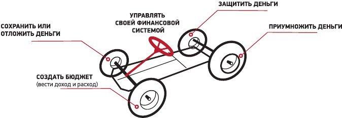 Также и в управлении финансами. Представьте самый простой автомобиль, как на картинке: четыре колеса и руль, где первое колесо – это ваше умение считать и планировать деньги, второе – навык откладывать деньги, третье – защита того, что откладываете, и четвертое колесо – навык приумножения денег. Вы же должны сесть за руль и управлять всей этой системой финансов. То есть сначала нужно научиться распоряжаться деньгами. Эффективнее будет делать это с инструктором. После того как вы наберетесь опыта и отточите навыки, достаточно будет обновлять знания и каждые несколько лет получать новые права на «управление капиталом».