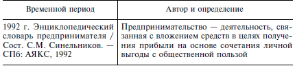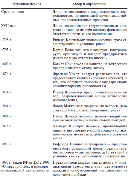 Отечественная экономическая наука советского периода если и рассматривала проблемы развития предпринимательства, то исключительно в связи с критикой тех или иных буржуазных теорий. Конечно, было бы неверно не отметить русскую экономическую мысль дореволюционного периода и ее видных представителей. В русской культуре традиции частного предпринимательства формировались и развивались в течение многих веков начиная со времен правления князя Рюрика (IX в.) и были прерваны социалистической революцией 1917 года. Коренная русская мысль отчетливо прослеживается в первом своде законов Русская Правда (1072), документах русских князей, Домострое (XVIII в.), произведениях Ф. Аквинского, A.Л. Ордин-Нащокина, И.Г. Посошкова, В.Н. Татищева, В.А. Кокорева, И.К. Бабста, А.И. Чупрова, И.В. Вернадского, В.П. Безобразова, М.И. Туган-Барановского, A.B. Чаянова и многих других. Вклад этих мыслителей велик и еще в должной мере не оценен.